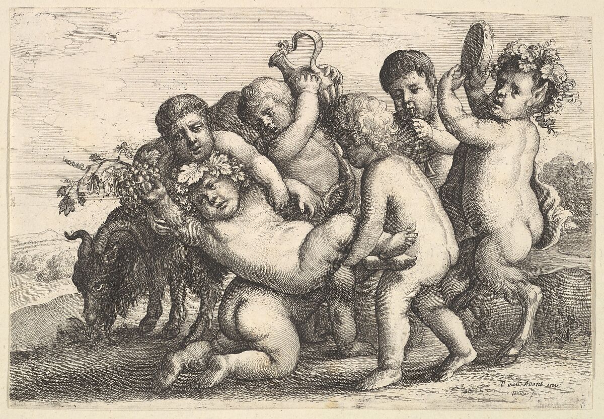 A young boy crowned with a wreath of grapes, holding a bunch of grapes, lifted by a young satyr and a boy over the back of a third boy, watched by a fourth, holding up a jug; a satyr playing a tambourine at right, and a boy playing a recorder; a goat grazing behind at left; after Peeter van Avont