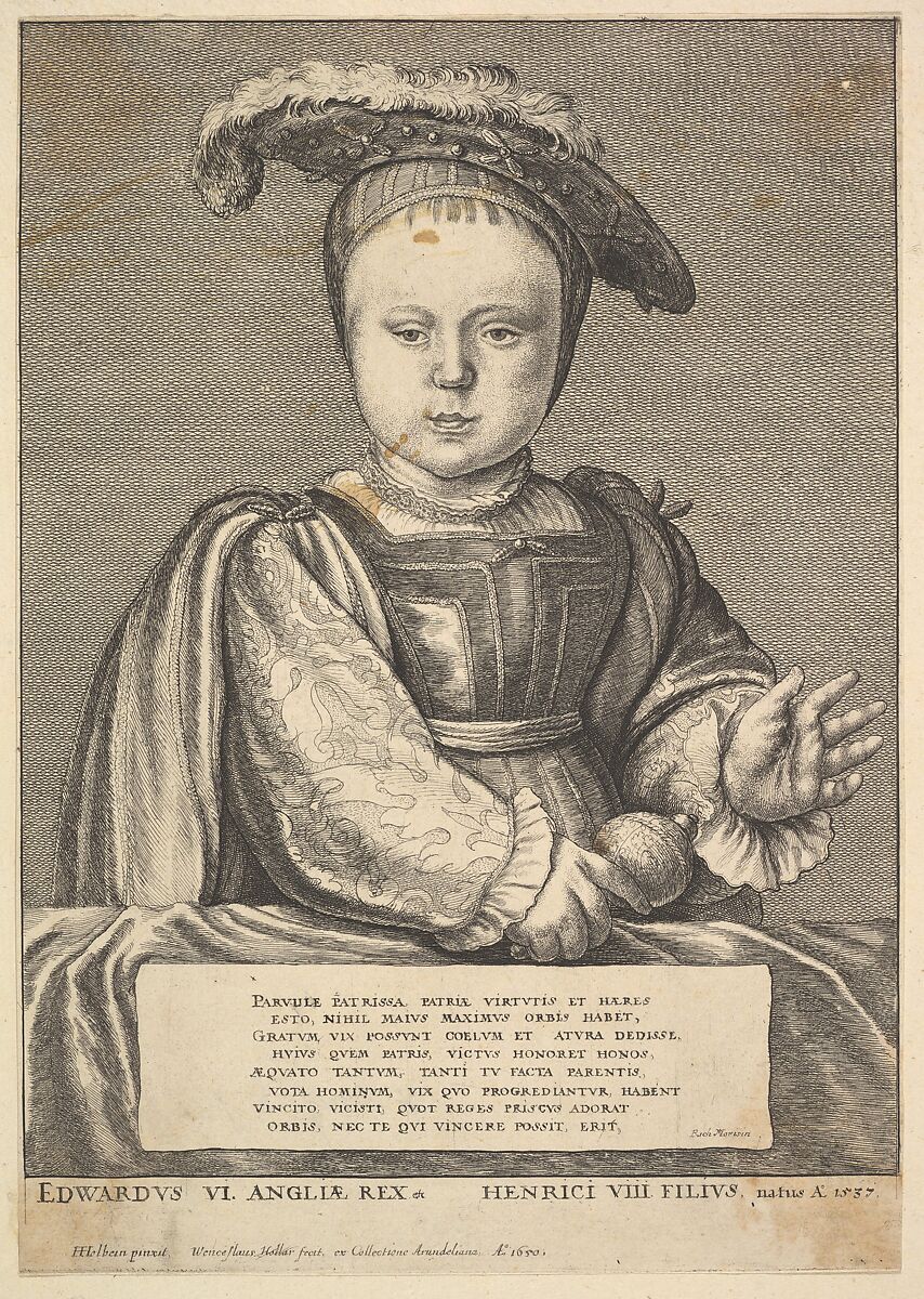 Portrait of Edward VI; half length, full face, shown as a baby holding a rattle, wearing a feather hat over a child's cap; behind a table covered in a cloth, with eight lines of Latin verse; after Holbein