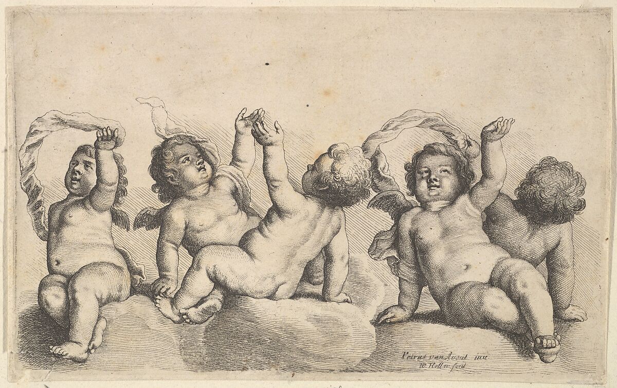 - Title: Three cherubs and two boys on clouds, each raising one arm