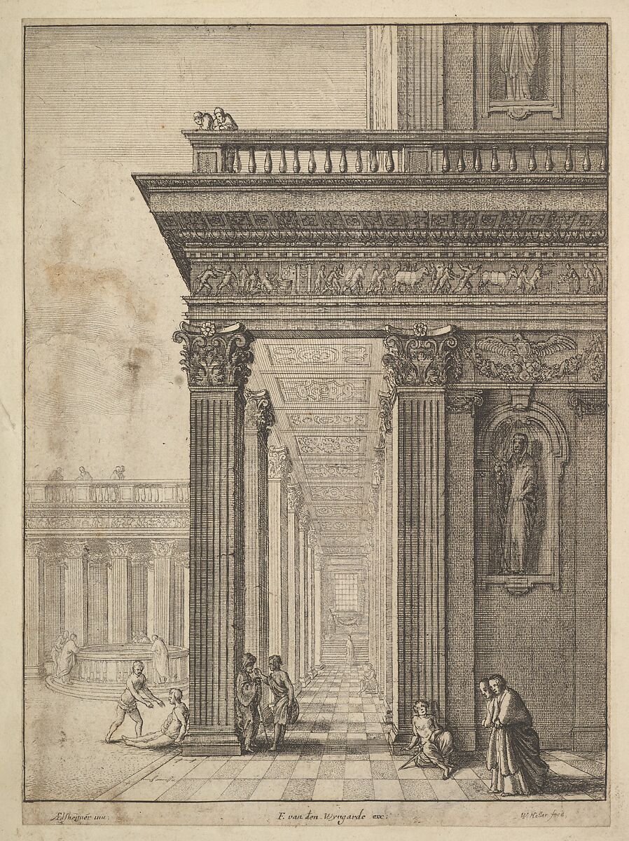 Temple colonnade and courtyard, with walking, seated and conversing figures, some looking down a well at left.