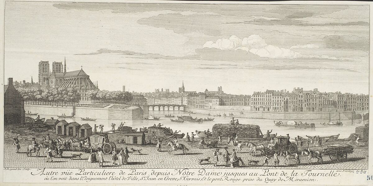 In this view of Paris from the Quai de Miramion, the focus is very much on the action of life along the Seine. Workmen handle cargo in boats on the river, a lady and gentleman clasp hands in the right foreground, and draft horses pull a load of wood on the far right. The two coaches in the foreground suggest the passage or arrival of wealthy passengers. The vantage point is one of several that Rigaud selected in his series of views of Paris. Rather than focusing on a single monument, the print displays a broad panorama. Notre Dame, the great Gothic cathedral of Paris, is placed in the distance on the far left, and the buildings of the Right Bank (Rive Droite) are visible in the background.