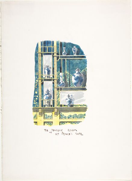 The interior designer Waller admired James McNeil Whistler and here freely records part of a famous interior created in 1877 for the London house of Frederick Leyland, a Liverpool shipping magnate. When the house was being remodelled, Thomas Jeckyll designed an Anglo-Japanese dining room that featured antique Spanish leather on the walls, with spindeled wooden shelves built to hold Leyland's Chinese porcelain collection. When Jeckyll fell ill, James McNeill Whistler volunteered to complete the decorations then, at his own volition, painted the leather blue and added extensive gold ornament, angering Leyland. This watercolor brightens the hues, and shows mirrors behind some of the shelves, possibly added by Leyland's heirs. In 1904, the collector Charles Freer purchased the room for his Detroit mansion, and it now is installed at the Freer Gallery, Washington DC.
