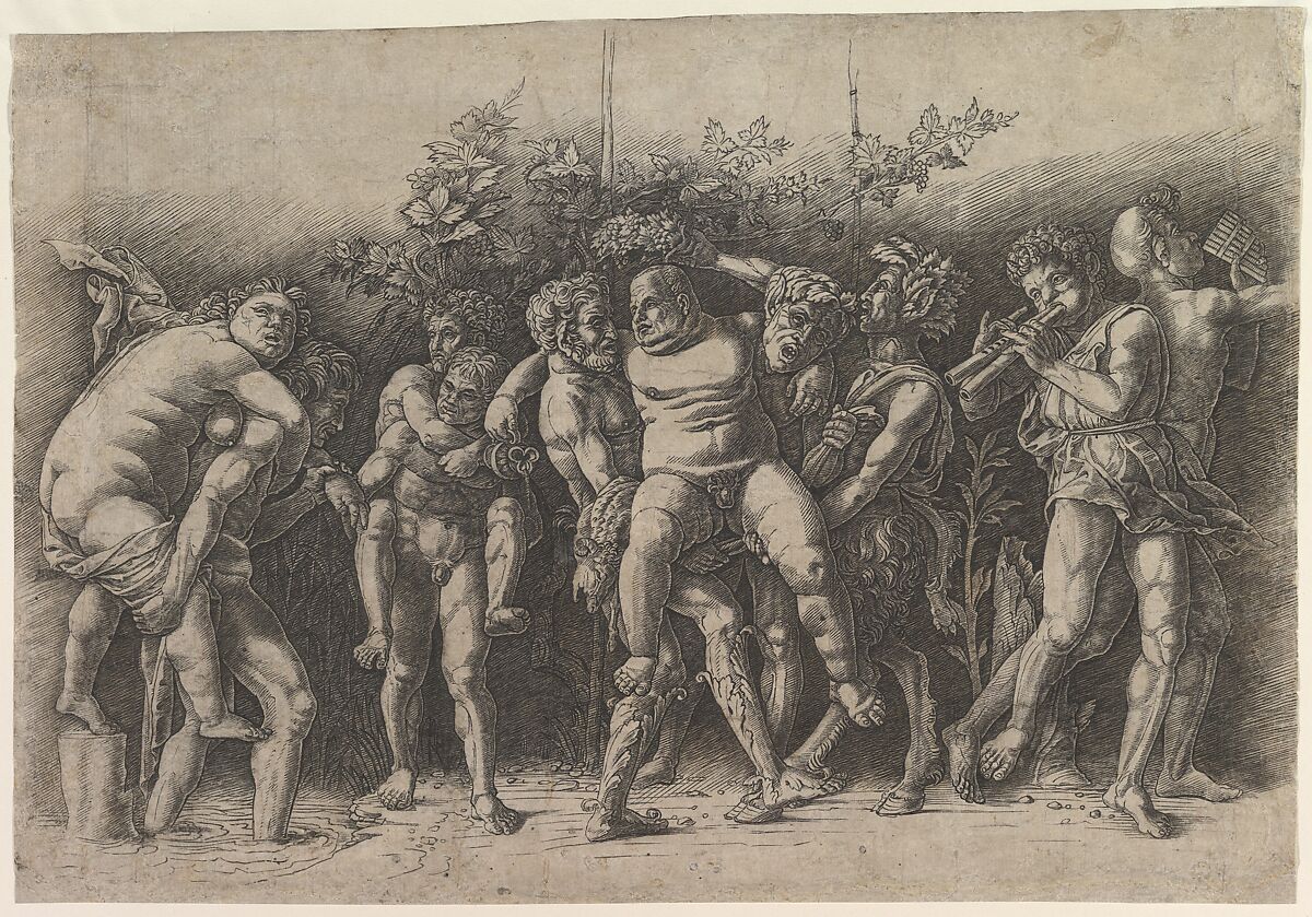 While the precise meaning of Mantegna's Bacchanals has eluded scholars, the most decisive event occurring in each is a coronation—an act that, by Mantegna's time, was often linked with the recognition of poetic gifts. In this engraving, the figure being crowned is clearly Silenus, the tutor of Bacchus, known for his wisdom as well as his drunkenness. In representing Silenus, any artist living in Mantua, the city of Virgil's birth, would have had in mind the poet's sixth Eclogue, in which Silenus is roused from drunken sleep by two satyrs and a nymph, bound with his own garlands, and forced to sing. His song of the creation and the ways of nature incited the fauns and wild beasts to move in a stately dance.