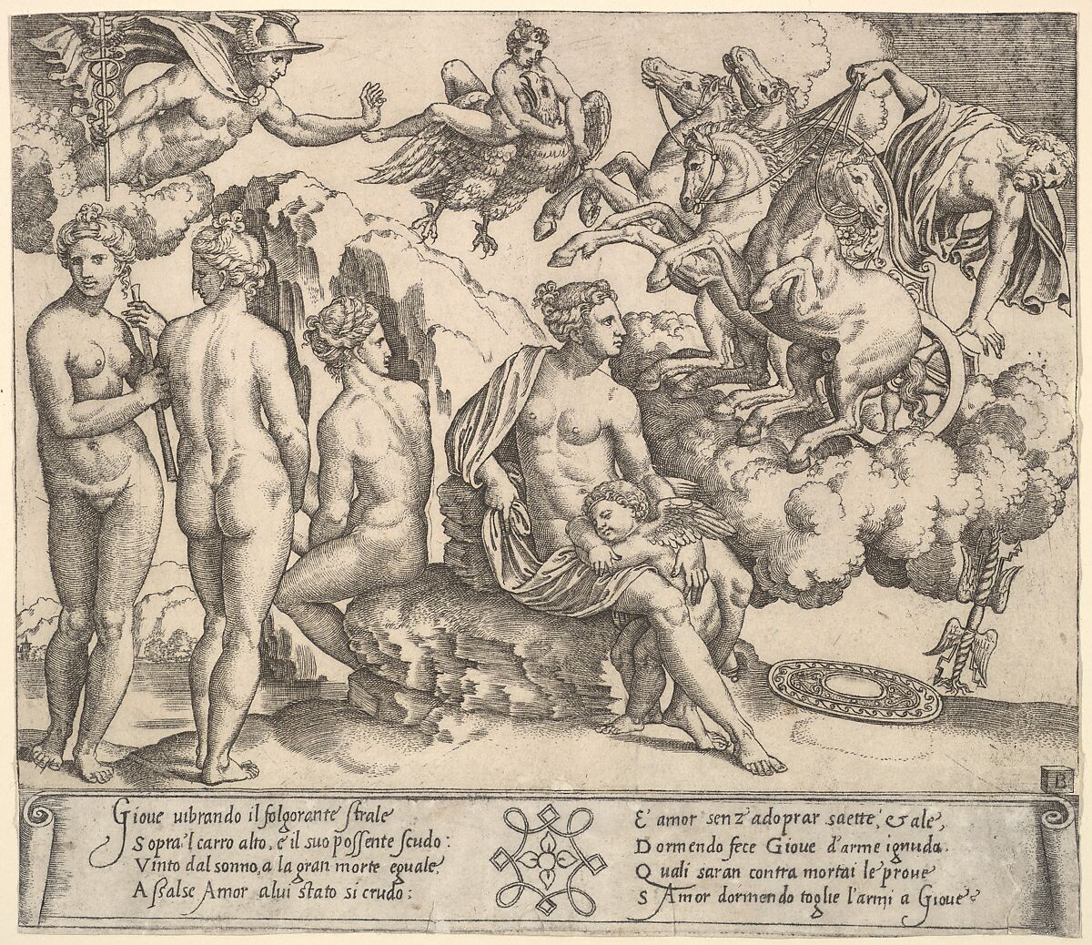 Following Ovid's brief account of Ganymede's abduction (Metamorphoses 10.155–61), the scene shown in this engraving is about love. Cupid is the central character, and Ganymede and the eagle are relegated accessories, testifying to the power of the infant god—even in his sleep—to disarm the supreme ruler of Olympus. Mercury, messenger of the gods, often assisted Jupiter with his love affairs. Here, he rushes to help his father, while Venus, in the company of the Graces, watches over her son.