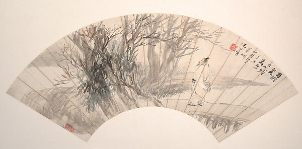 Ni Tian successfully imitated Ren Yi's popular style, ensuring that a second generation of Shanghai patrons could still buy Ren Yi-style works. The freely impressionistic foliage in this fan converts a conventional image of a scholar in a landscape into a fashionable fin-de-siècle production. Layers of built-up ink in the foreground trees project the branches forward in the manner of a spatial experiment undertaken by Ren Yi.