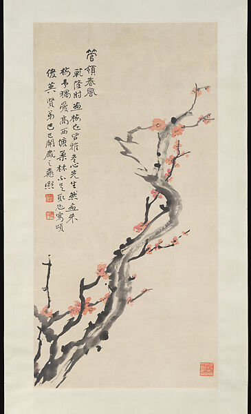 A fluid surge of ink traces the line of sap in a flowering branch. Zeng's inscription, written in a style that conveys his study of Han clerical script, notes the popularity of plum painting during the Qianlong era (1736–95), but identifies Jin Nong's (1687–1764) plum style as his favorite. Zeng Xi's freely brushed branch in dilute ink expresses his admiration of Jin Nong through emulation.