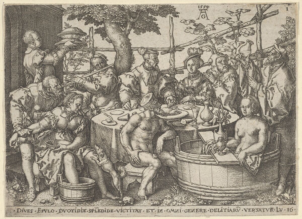 Dives, at center, dining with a woman before a trellis. A variety of other figures are gathered around the table, including at woman in a bath, a flautist, a fool, a figure letting blood from a seated female, and a servant bringing food to the table. Based on Luke 16:19. Plate 1 from a series of five engravings.