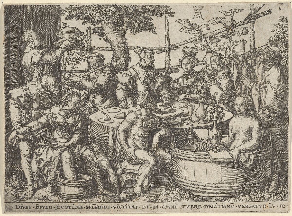 Dives, at center, dining with a woman before a trellis. A variety of other figures are gathered around the table, including at woman in a bath, a flautist, a fool, a figure letting blood from a seated female, and a servant bringing food to the table. Based on Luke 16:19. Plate 1 from a series of five engravings.