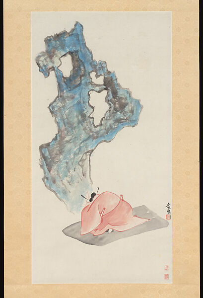 Yu Ming, a close friend of Wu Changshi (1844–1927), worked in Shanghai, primarily as a figure painter. Here, Yu depicts a famous story about the Northern Song poet, politician, painter, and connoisseur Mi Fu (1052–1107), who was known as much for his outspokenness as for his refined tastes. The painting recalls Mi's appointment to the post of magistrate in the district of Wuwei (present-day Anhui). When Mi entered the official residence for the first time, he was struck by an imposing rock in the garden. He immediately called for his official robe and tablet of office, then bowed deeply to the stone, addressing it as "Elder Brother Rock."