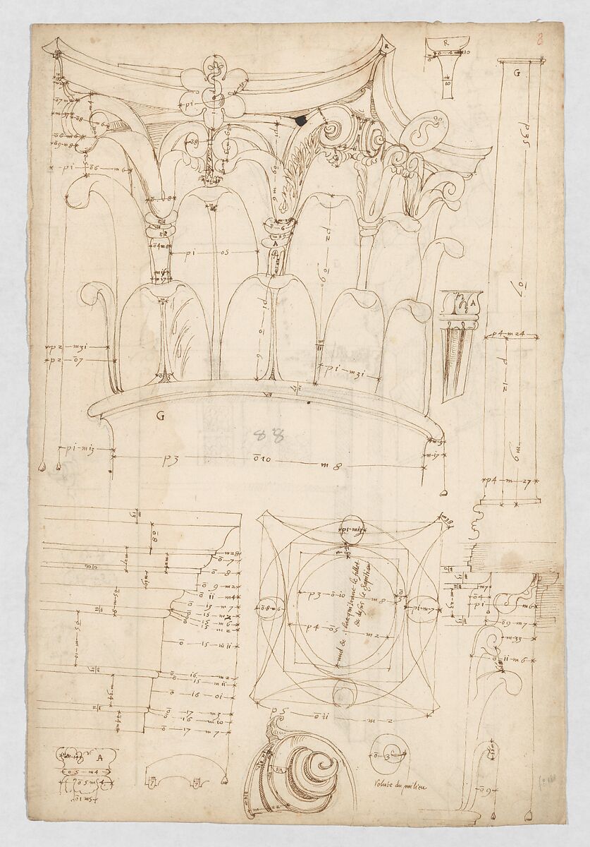 - Title: Pantheon, portico, Corinthian column capital, projection, plan, and details; column shaft, profile; beam architrave, elevation (recto) Pantheon, cella, perspective, details; vault, details; portal, interior, cornice, profile (verso)