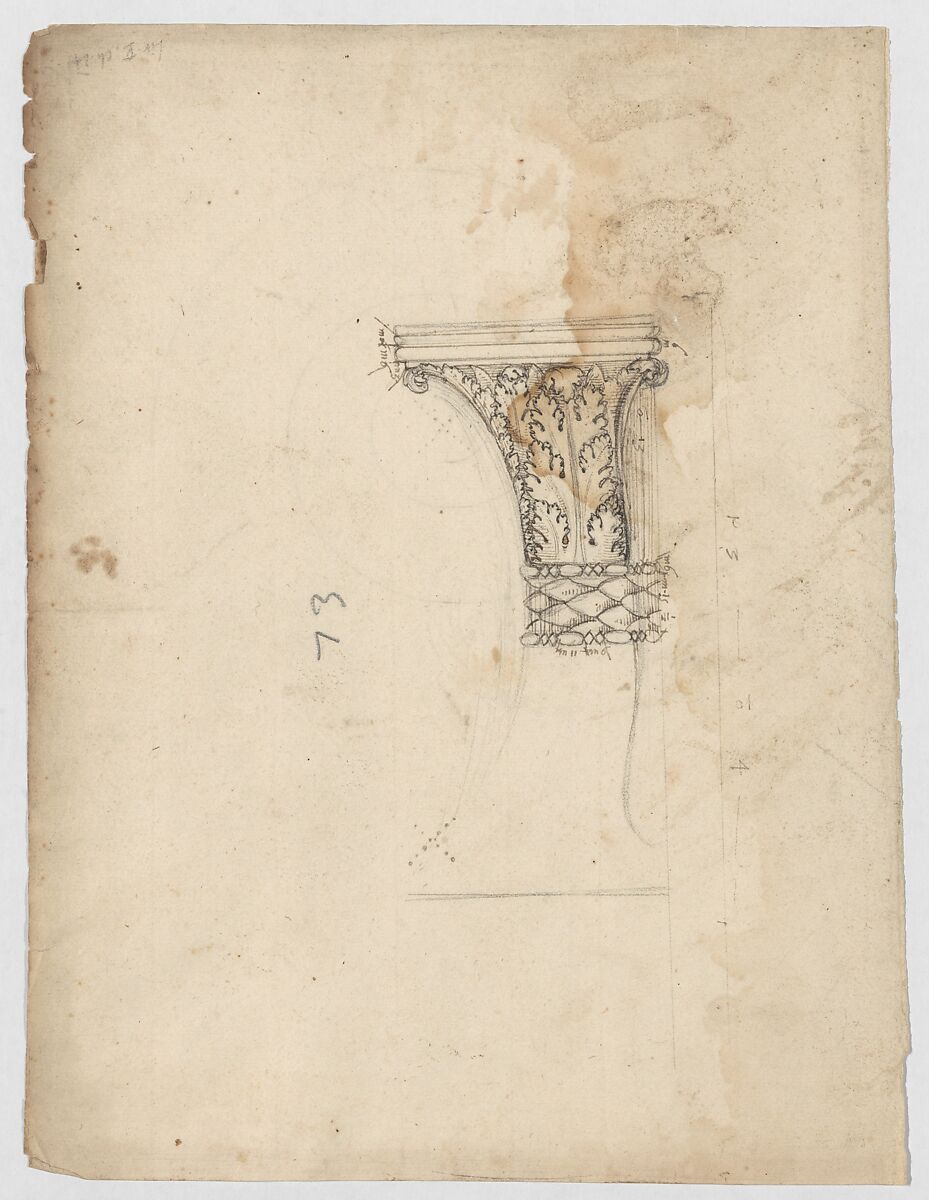 - Title:S. Maria in Trastevere, Ionic capital, side elevation (recto); Unidentified, Ionic capital volute, construction diagram (verso)