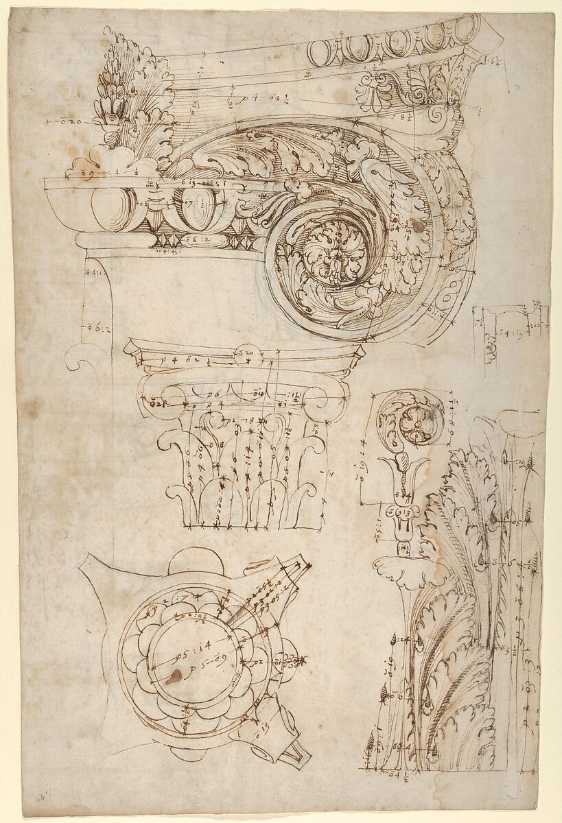 - Title: Composite capital, plan, elevation, and details; frieze, detail (recto) Forum of Nerva, entablature and attic, profiles; portico, perspective, and cornice, profile (verso)