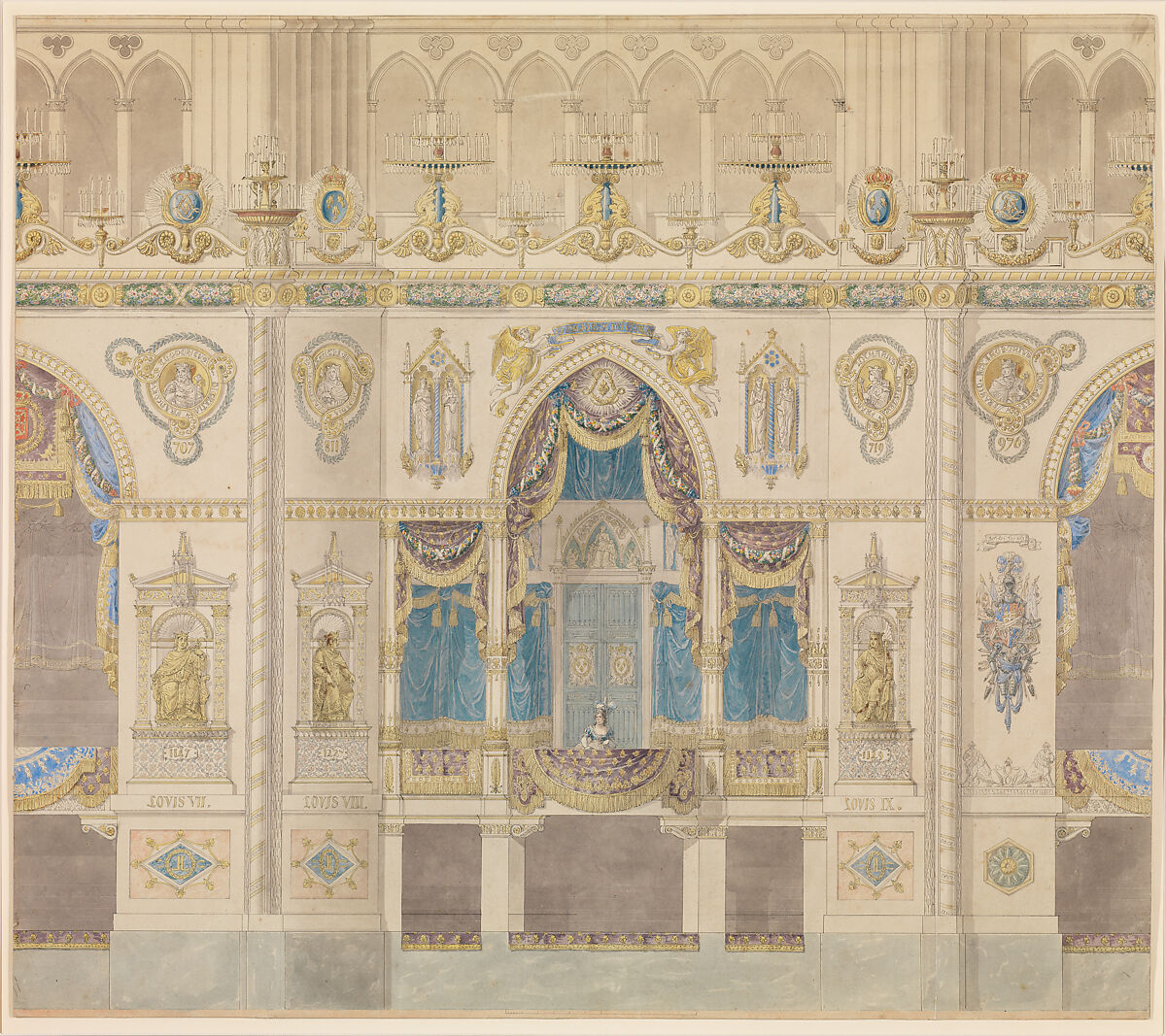 This sheet shows an elevation of part of the interior of Reims Cathedral with the royal box for the coronation of King Louis XVIII. This design represents one of six drawings that form the only documentation of the plans for the coronation of King Louis XVIII, which never took place. The event was likely delayed, and eventually dismissed due to the precarious state of the French monarchy and the declining health of the King. In addition, the idea of a Royal coronation, bestowed by the French Catholic Church had become a point of contention after the fall of the first monarchy and the Emperor Napoleon’s decision to crown himself. For these reasons, King Louis XVIII’s successor, Charles X, opted not to have a coronation in Reims when he ascended the throne in 1824. Some of the concerns for how the coronation would be perceived can be noted in the decoration scheme that was devised by Percier and Fontaine. The architect duo had also been the official designers for the coronation of Emperor Napoleon. To mark the distinction, in their designs for Reims Cathedral, they veered away from the vocabulary of the Empire Style, and instead worked in a style known as Palladian Gothic. In addition, they incorporated references to the historic legitimacy of the Bourbon dynasty throughout their decoration scheme.