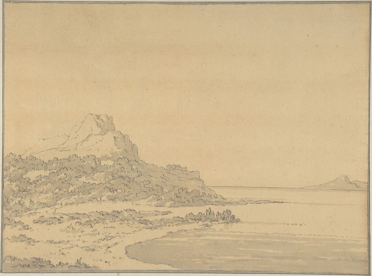 In this imaginary view of a coastal landscape, a low shoreline on the left opens onto the sea and is framed in the background by a wooded hill. In the distance, a mountain castle overlooks the bay and a small island closes off the image to the right. The landscape is built up from just a few brush strokes in gray wash that are further accentuated with delicate graphite linework to indicate topography. Using the blank paper as the base tone of his composition, the artist skillfully interlaces dark and light areas in the water and on land to enliven an otherwise simple composition. This seemingly simple technique is highly effective in creating the impression of a sundrenched view.