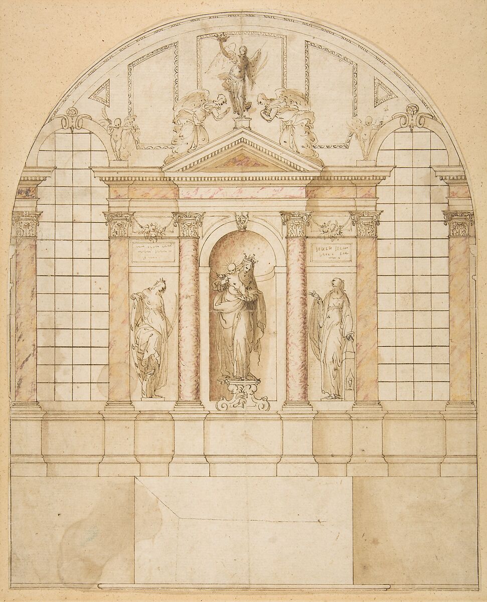 - Medium: Pen and brown ink, brush and brown and rose wash