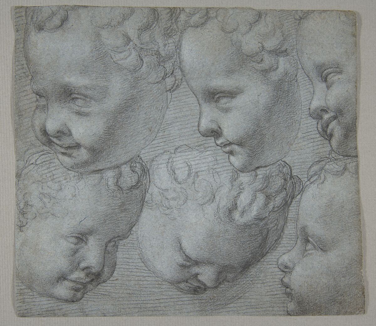 During the Italian Renaissance, drawing sculptures was a fundamental step in the training of a young draftsman. On this sheet, the artist known as Poppi (from his birthplace in Tuscany) drew a group of six studies of heads after a three-dimensional model, a sculpture or marble relief of a putto or a cherub. The artist changed his position point of view for each study, filling the page with the same motif from various angles in order to achieve a full understanding of its form and volume. The present sheet is directly comparable to a large series of drawings in the Uffizi, Florence done similarly from cast copies and sculptures. This type of smiling, or laughing, infant heads surprisingly resembles examples by Jacopo Sansovino (1486-1570). The sheet may date between Poppi’s 1572 trip to Rome - where he was greatly exposed to sculpture, both antique and contemporary - and 1574, the year of his admission to the Accademia del Disegno in Florence.