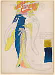 Drawing, design for a woman's costume by Vincente Minnelli. The costume consists of an empire waist, lean gown of dark blue color with white, green, orange, and silver trimmings. The shoulders are decorated with green shurrles and green and wite beads; the sleeves are bell-shaped, with layers of white fabric and silver brooches with offsetting scrolls on the upper arms. The waistline is marked by a strip of small, round pearls. The skirt of the gown has an opening on the left side, marked by silver beads, and with large, hanging, teardrop pearls. A large headdress of green, white, and orange strips of rolled fabric, decorated with strips of pearls, and with two large scrolling strips of pearls flanking its sides, covers the head. A matching white and orange scarf is tied around the neck.