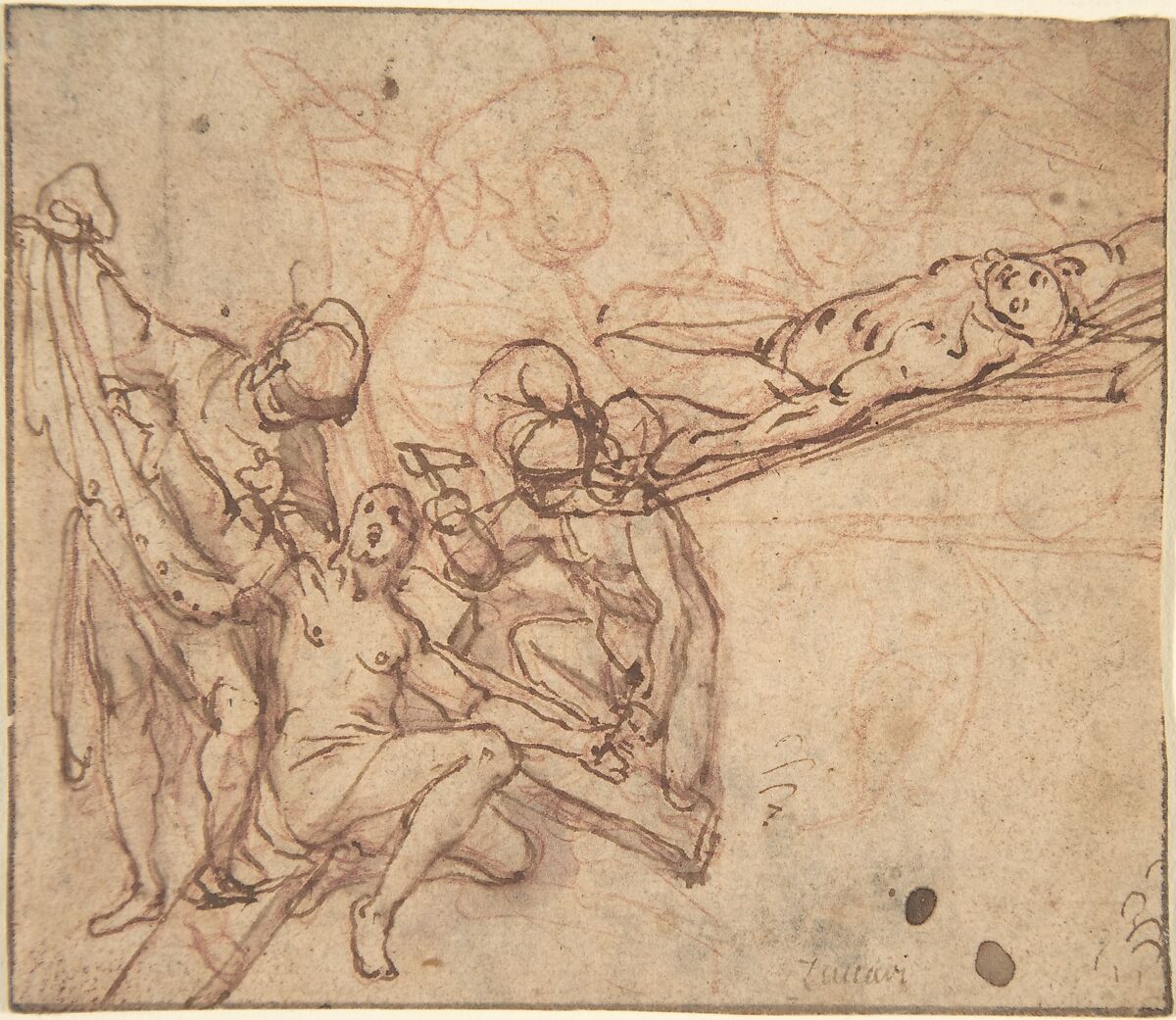 - Medium: Pen and brown ink, brush and brown wash, over red chalk; framing lines in pen and brown ink