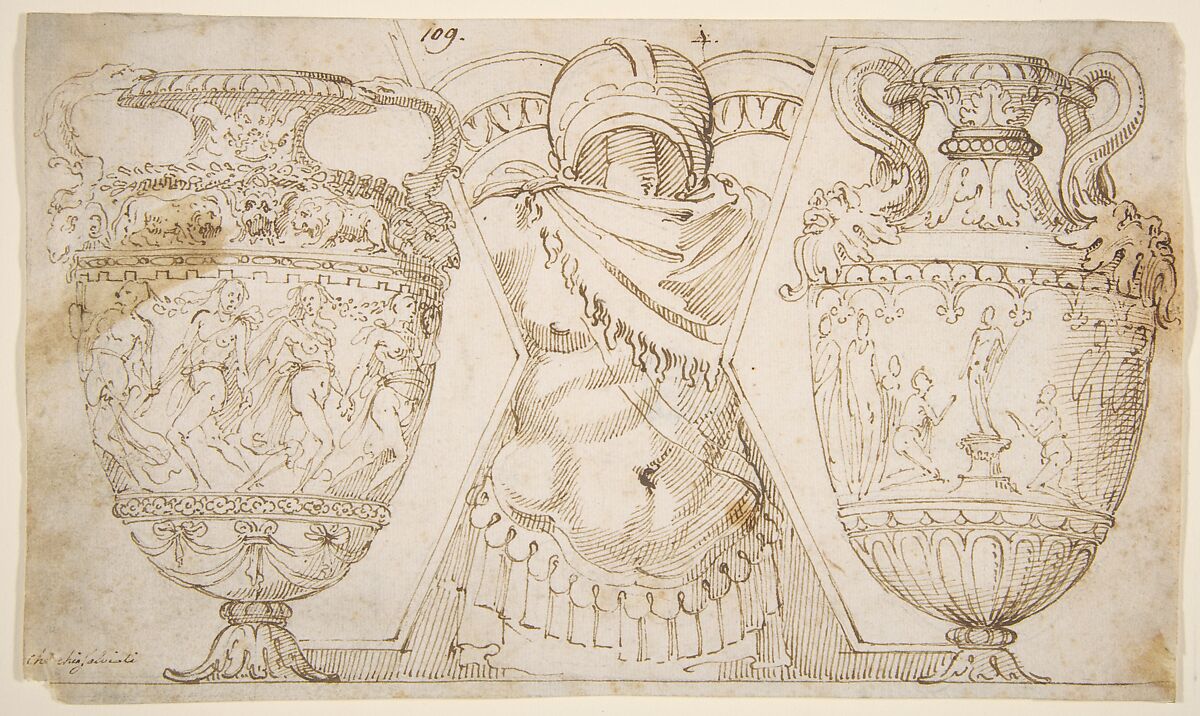 - Title: Ornamental Design with Amphore and Antique Style Armor (recto); Sketch with Two Figures (verso)