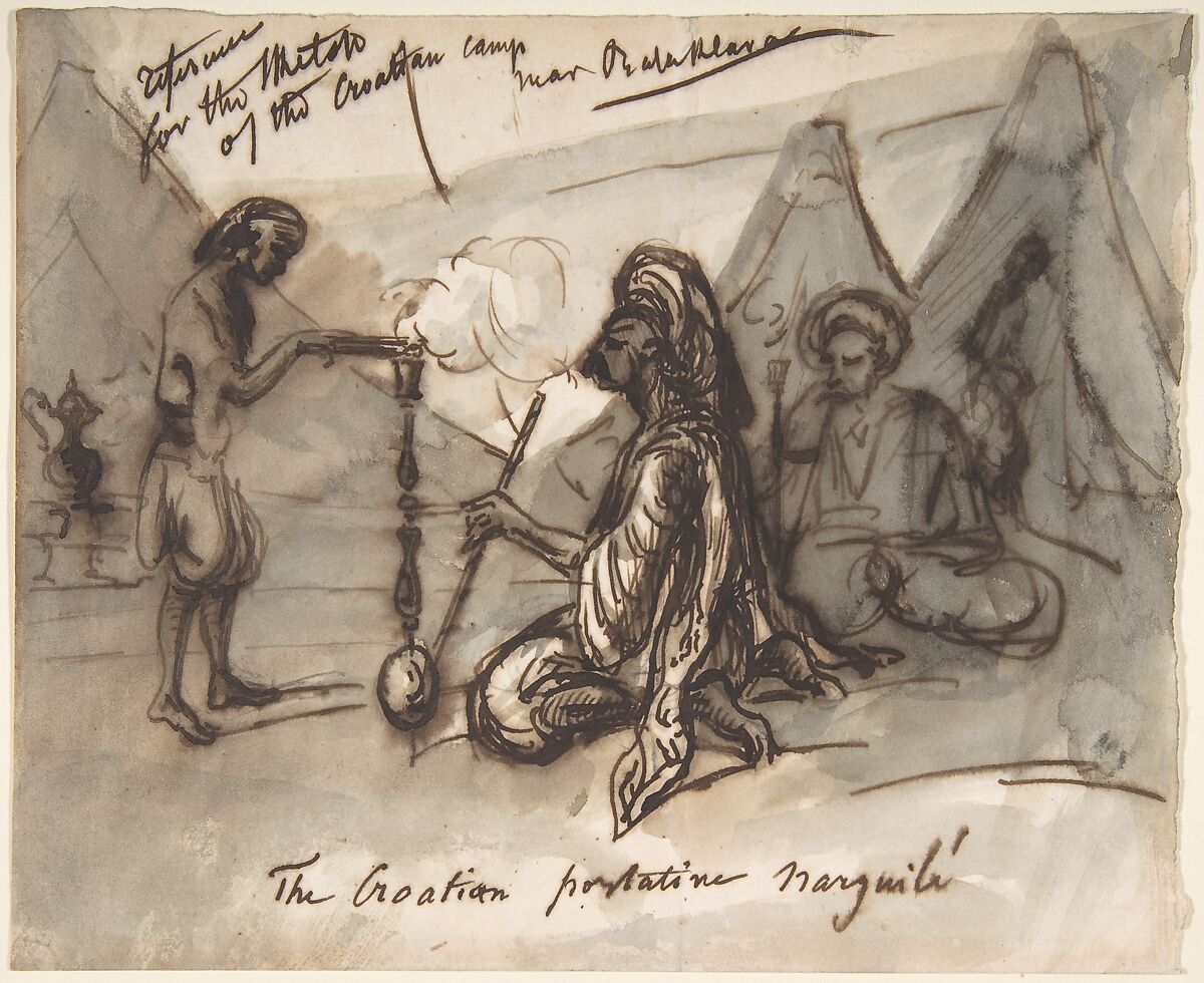 Guys made this drawing while serving as correspondent for the "Illustrated London News" during the Crimean War (1853-56). In 1855, Croats assisted the British and French in clearing land to build a railway from Balaclava toward Sebastopol. This quick sketch of a man smoking a portable hookah served as a reference for a larger, more complex scene, "Croatian Camp" (Smith College Museum of Art), which was published as a wood engraving on September 8, 1855.