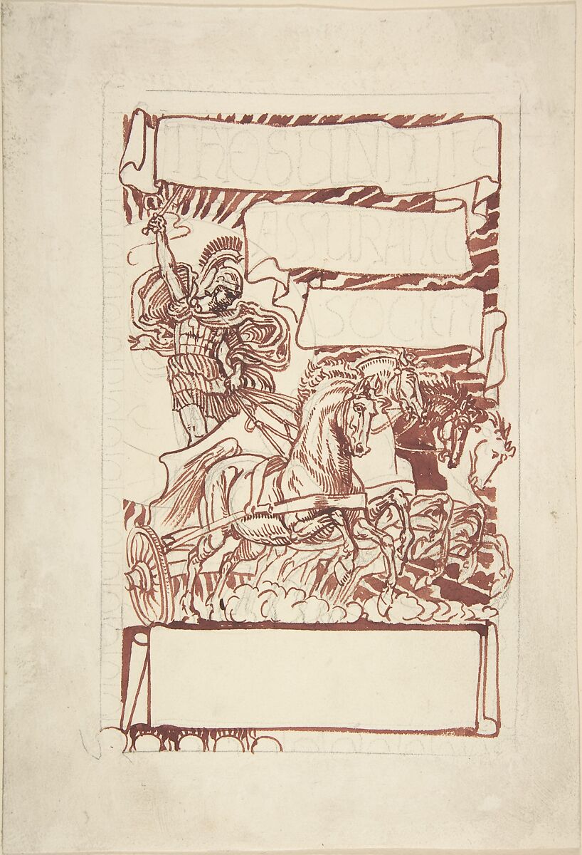 Crane was a prolific designer of a range of printed materials including playbills, magazine covers, private view invitations and posters. He also received many commissions from commercial organizations for documents including, as here, a certificate for an insurance company, Sun Life Assurance Society, which was founded in 1810. The dynamic design features a charioteer charging forward led by four galloping horses, silhouetted against a blazing sunburst, in reference to the company's name. Blank areas were left throughout the design to be filled later; the intended lettering is faintly indicated by the artist in graphite.