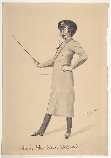 The wordly American painter James Abbot McNeill Whistler, sporting his characteristic monocle and garbed in a floppy hat, elegant overcoat and fancy shoes adorned with conspicuous bows, assumes something of the aspect of a dandy in this portrait by the British painter and draftsman Walter Greaves. What appears to be a walking stick proffered by the posturing artist may in fact be a mahlstick (a tool used by artists to work on a canvas without getting to close to its surface and smearing the paint). A one-time associate and collaborator, Greaves was later rebuffed by Whistler and died in poverty and oblivion. This portrait was made shortly before the rupture.