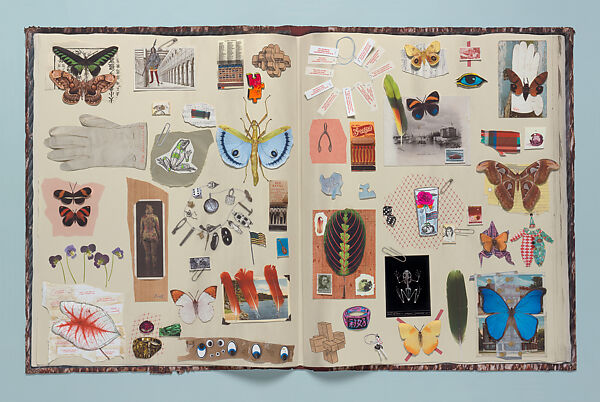In both its title and collage-like composition, Jane Hammond’s piece evokes the paradoxical combination of convention and inherent uniqueness that characterize the scrapbook genre. Utilizing a personal lexicon that consists of miniaturized references to her own artwork—such as the three-dimensional print Clown Suit and Tabula Rosa, the life-sized self-portrait of her nude tattoo-covered body— and to both found and imaginary items drawn from sources such as botany, biology, and documentary photography, Scrapbook reflects Hammond’s interest in the archive and the combination of diverse objects and sources of information.