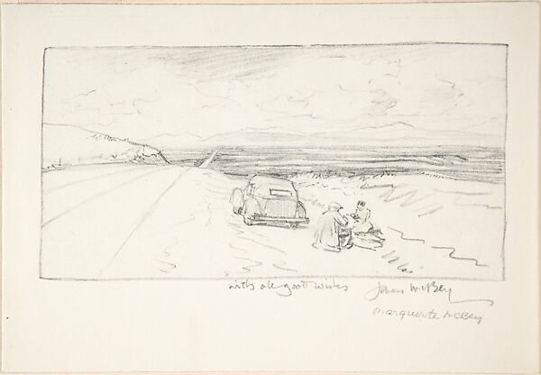 The inscribed greeting and double signatures below this sketch of a man drawing and woman reading near their sedan indentify the figures as the Scottish artist McBey and his young American wife Marguerite, a photographer and bookbinder. The likely recipient was the etcher John Taylor Arms, who donated the drawing to the Museum. During the Second World War the McBeys were unable to return to their London home and made a cross-country trip. The open plain and straight road receding towards mountains shown here suggest a western site.