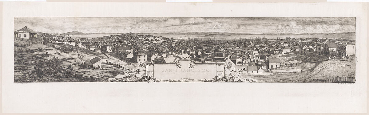 the subject of this panoramic view. He received the commission for this unusually large plate from two real estate speculators, whose profiles appear above the inscription, and who seem to have intended to use the print to sell shares in a fraudulent Franco-Californian company. The artist based the image on five daguerreotypes (now in the collection of the Art Institute of Chicago) and complained about the difficulty of synthesizing the photographs, which had been taken from different positions and under varying lighting conditions.