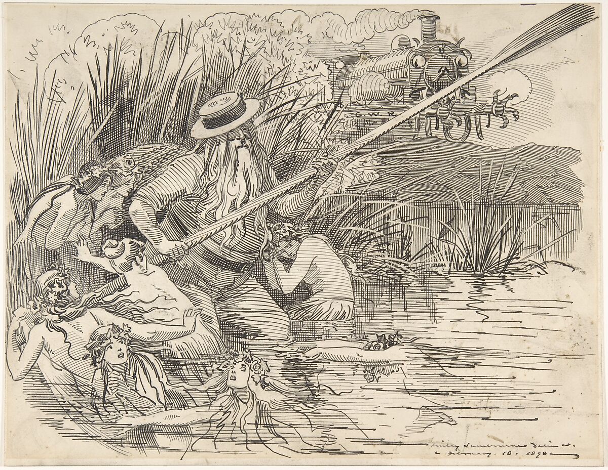Sambourne here humorously contrasts modernity (the expansion of British railroads) with tradition (the River Thames used as the primary means of travel west of London). A bearded Father Thames stands amongst reeds but wears modern skulling gear and wields an oar. He is surrounded by water nymphs frightened by a steam engine looming over them on an embankment. The latter resembles a monster with rolling eyes and pronged couplers. The image cleverly responds to John William Waterhouse's "Hylas and the Nymphs" (1896), exhibited at the Royal Academy in the summer of 1897 by including lovely nudes whose long hair is entwined with flowers like those in the painting.
