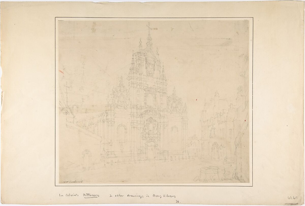 William Smallwood trained as an architect and spent his brief career making detailed drawings of churches and old buildings in England, France and Belgium. Some were reproduced in the "Penny Magazine" and he exhibited examples at the Royal Academy. Here, he drew the main facade of a Catholic church in Brussels, a seventeenth-century building attributed to the Flemish architect Lucas Faydherbe (1617-1697). This replaced an older Gothic structure partly destroyed by Calvinists in 1584. A fine example of the Brabantine Baroque style, the church stands on the Place du Béguinage or Begijnhofplein.
