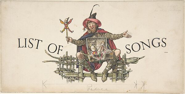 This design was made for a 1912 publication containing music by Joseph Moorat and illustrations by his brother-in-law Paul Woodroffe. After studies at the Slade School, the latter joined the Art Workers' Guild, then became part of the circle of Charles Robert Ashbee, whose Guild of Handicraft and Essex House Press had moved to Chipping Campden, Gloucestershire from London in 1902. Moorat already lived in nearby Westington and, when Woodroffe bought an adjacent cottage in 1904, Ashbee supervised the renovations. Working at the heart of the Arts and Crafts community, and aware of predecessors and contemporaries, Woodroffe here draws a peddler reminiscent of figures by William Heath Robinson and Arthur Rackham.