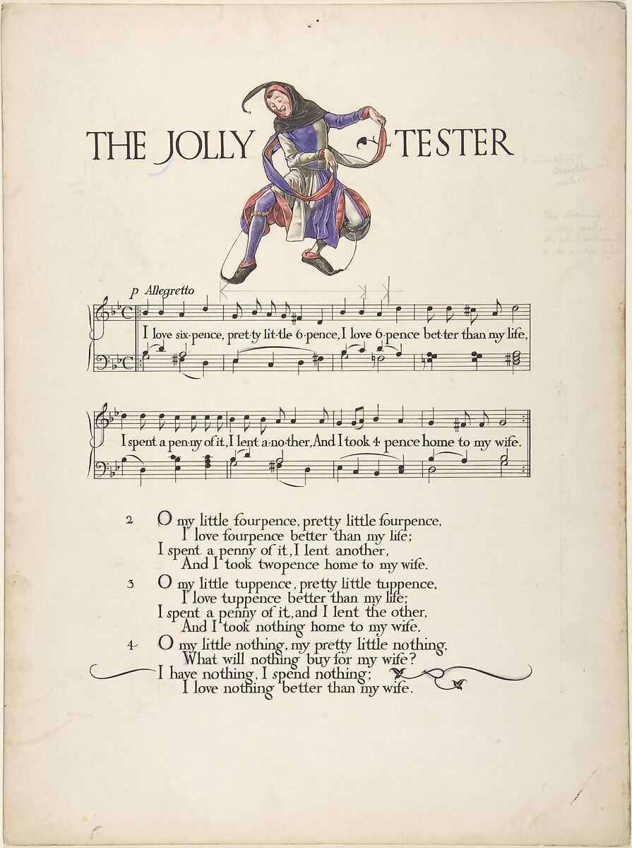 This design was made for a 1912 publication containing music by Joseph Moorat and illustrations by his brother-in-law Paul Woodroffe. After studies at the Slade School, the latter joined the Art Workers' Guild, then became part of the circle of Charles Robert Ashbee, whose Guild of Handicraft and Essex House Press had moved to Chipping Campden, Gloucestershire from London in 1902. Moorat already lived in nearby Westington and, when Woodroffe bought an adjacent cottage in 1904, Ashbee supervised the renovations. Working at the heart of the Arts and Crafts community, and aware of predecessors and contemporaries, Woodroffe here draws a dancing jester reminiscent of figures by Walter Crane.
