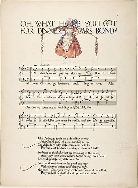 This design was made for a 1912 publication containing music by Joseph Moorat and illustrations by his brother-in-law Paul Woodroffe. After studies at the Slade School, the latter joined the Art Workers' Guild, then became part of the circle of Charles Robert Ashbee, whose Guild of Handicraft and Essex House Press had moved to Chipping Campden, Gloucestershire from London in 1902. Moorat already lived in nearby Westington and, when Woodroffe bought an adjacent cottage in 1904, Ashbee supervised the renovations. Working at the heart of the Arts and Crafts community, and aware of predecessors and contemporaries, Woodroffe here draws an angry inn-keeper carrying sage and onions to roast a duck―her figure reminiscent of images by William Heath Robinson.