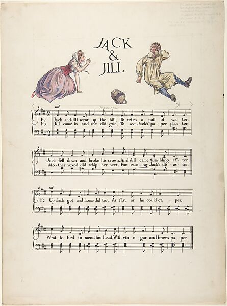 This design was made for a 1912 publication containing music by Joseph Moorat and illustrations by his brother-in-law Paul Woodroffe. After studies at the Slade School, the latter joined the Art Workers' Guild, then became part of the circle of Charles Robert Ashbee, whose Guild of Handicraft and Essex House Press had moved to Chipping Campden, Gloucestershire from London in 1902. Moorat already lived in nearby Westington and, when Woodroffe bought an adjacent cottage in 1904, Ashbee supervised the renovations. Working at the heart of the Arts and Crafts community, and aware of predecessors and contemporaries, Woodroffe here represents Jack and Jill as adults wearing traditional country garb.