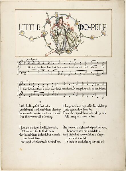 This design was made for a 1912 publication containing music by Joseph Moorat and illustrations by his brother-in-law Paul Woodroffe. After studies at the Slade School, the latter joined the Art Workers' Guild, then became part of the circle of Charles Robert Ashbee, whose Guild of Handicraft and Essex House Press had moved to Chipping Campden, Gloucestershire from London in 1902. Moorat already lived in nearby Westington and, when Woodroffe bought an adjacent cottage in 1904, Ashbee supervised the renovations. Working at the heart of the Arts and Crafts community, and aware of predecessors and contemporaries, Woodroffe here represents Bo-Peep as a Pre-Raphaelite maiden with long red hair, surrounded by daisies.