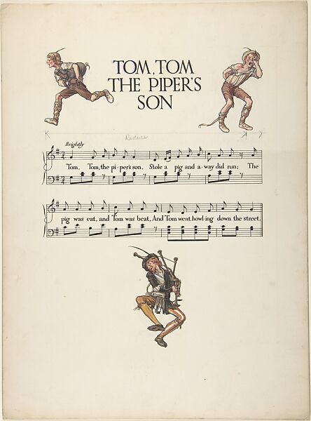 This design was made for a 1912 publication containing music by Joseph Moorat and illustrations by his brother-in-law Paul Woodroffe. After studies at the Slade School, the latter joined the Art Workers' Guild, then became part of the circle of Charles Robert Ashbee, whose Guild of Handicraft and Essex House Press had moved to Chipping Campden, Gloucestershire from London in 1902. Moorat already lived in nearby Westington and, when Woodroffe bought an adjacent cottage in 1904, Ashbee supervised the renovations. Working at the heart of the Arts and Crafts community, and aware of predecessors and contemporaries, Woodroffe here represents a piper playing at the bottom of the page, as his son above, steals a pig and then cries at its loss.