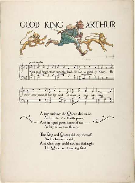 This design was made for a 1912 publication containing music by Joseph Moorat and illustrations by his brother-in-law Paul Woodroffe. After studies at the Slade School, the latter joined the Art Workers' Guild, then became part of the circle of Charles Robert Ashbee, whose Guild of Handicraft and Essex House Press had moved to Chipping Campden, Gloucestershire from London in 1902. Moorat already lived in nearby Westington and, when Woodroffe bought an adjacent cottage in 1904, Ashbee supervised the renovations. Working at the heart of the Arts and Crafts community, and aware of predecessors and contemporaries, Woodroffe here represents King Arthur carrying off sacks of barley meal, accompanied by playful armorial lions.