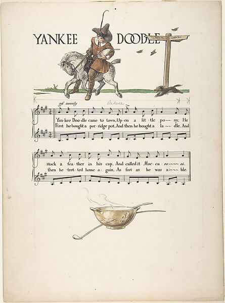 This design was made for a 1912 publication containing music by Joseph Moorat and illustrations by his brother-in-law Paul Woodroffe. After studies at the Slade School, the latter joined the Art Workers' Guild, then became part of the circle of Charles Robert Ashbee, whose Guild of Handicraft and Essex House Press had moved to Chipping Campden, Gloucestershire from London in 1902. Moorat already lived in nearby Westington and, when Woodroffe bought an adjacent cottage in 1904, Ashbee supervised the renovations. Working at the heart of the Arts and Crafts community, and aware of predecessors and contemporaries, Woodroffe here represents Yankee Doodle as a puritan astride a pony, holding a porridge pot and ladle―the latter elements repeated at the bottom of the page.