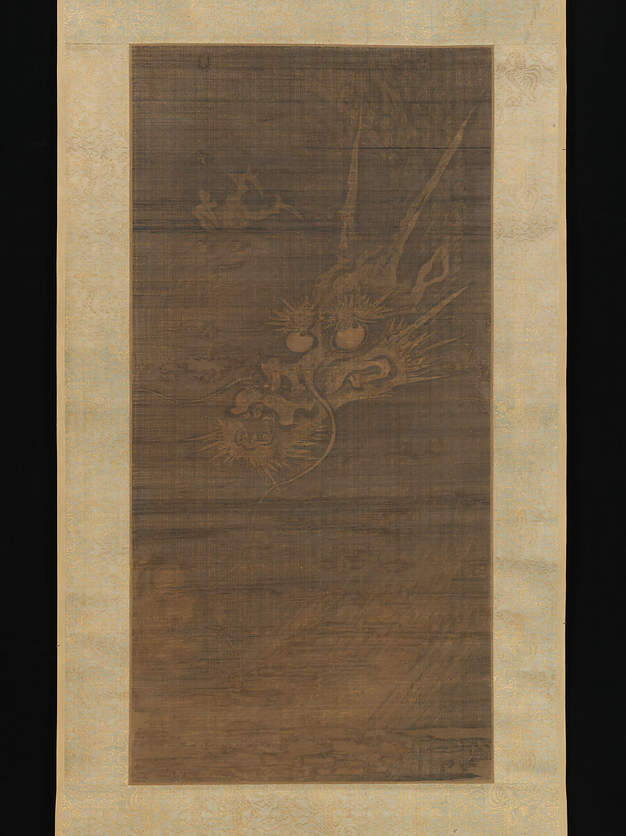 Dragons were believed to dwell in mysterious places—clouds, mists, watery subterranean caves—and painters used a repertoire of techniques to capture that sense of mystery. Here, the artist has painted the background with a dark ink wash. The slightly lighter dragon emerges from the primordial ooze. Lightest in tone are the beast’s arresting eyes, which accordingly jump forth from the image.