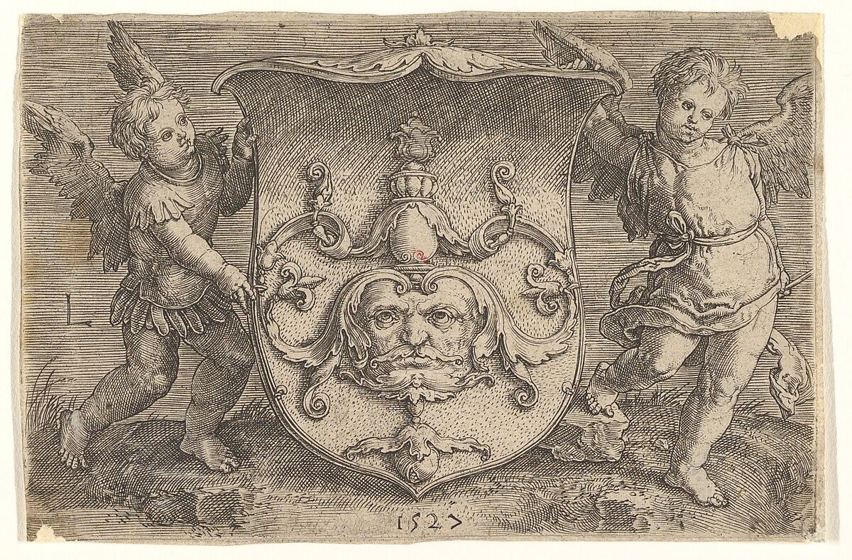 - Title: Coat of Arms with a Mask, Held by Two Genii