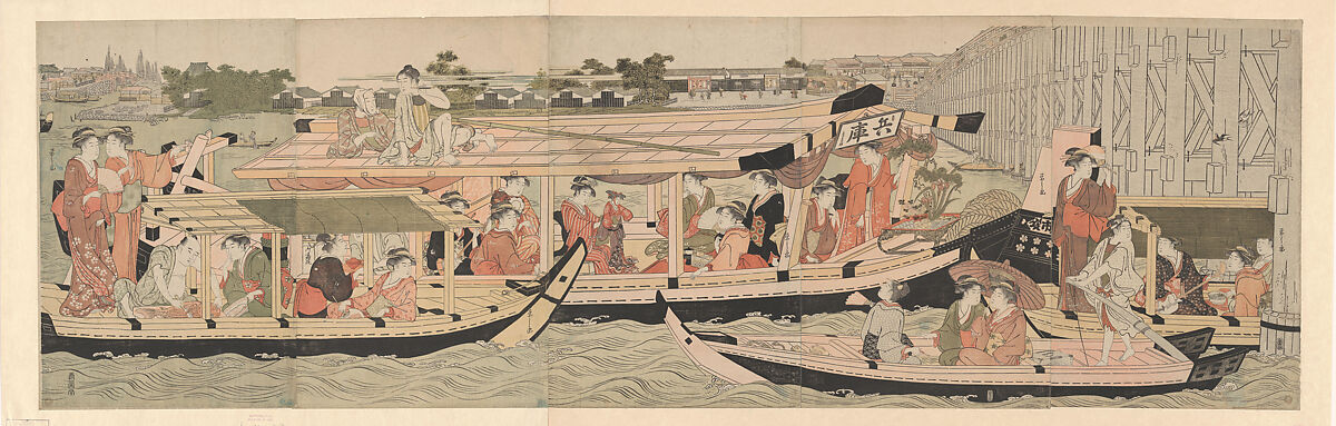 This print illustrates the great festival that marked the beginning of the summer season on the Sumida River. In a large, roofed boat (yakata-bune) at the center of the composition, a group of beauties is watching a young woman controlling a dancing puppet, while other female entertainers play music. In another boat, a man is shown slicing up a large fish for an onboard banquet.