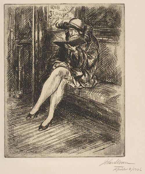 Sloan, a chronicler of scenes observed on the streets of New York, wrote in his diary that the lines of seventeenth-century British poet John Suckling came to mind when he encountered a woman reading on a subway car. Suckling’s poem reads: "Her feet beneath her petticoat / Like little mice peeped in and out, / As if they feared the light." The advertisement behind the woman’s head includes an amusing detail, publicizing Sloan’s liniment—a lotion meant to relieve hand pain.