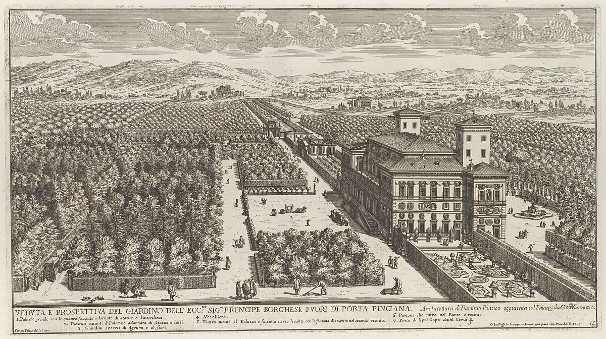 Standing at the center of the park on the Pincian Hill with a circumference of almost four miles, the Villa Borghese was Rome's ultimate entertainment retreat. Today, as the Galleria Borghese it houses an important collection of paintings and classical sculpture. Commissioned by Cardinal Scipione Borghese, the villa was built by Flaminio Ponzio and Giovanni Vansanzio (Jan van Zanten) in the early seventeenth century. Filled with statues and vases, its decorative outer facades resemble a scenae frons, exemplifying the highly theatrical aspect of Roman Baroque villa architecture, also characteristic of the Villa Medici and the Villa Doria Pamphilj.
