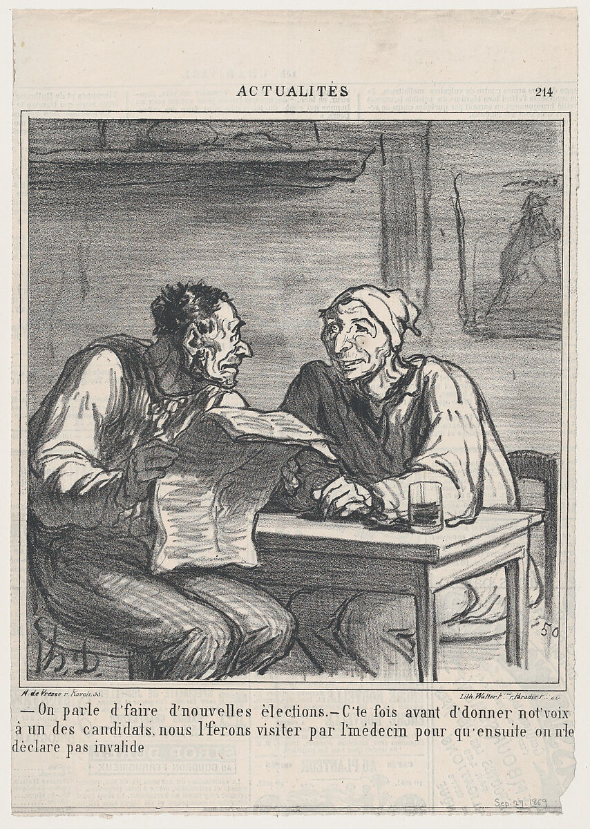 –They're talking about new elections. –Before I vote for a candidate, I want him to be examined by a doctor to make sure he is not declared invalid again, from 'News of the day,' published in Le Charivari, September 27, 1869