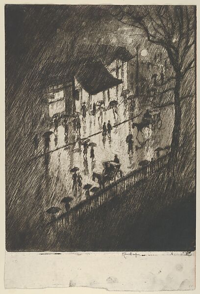 Pennell, a Philadelphia-born Quaker, spent the first two decades of his career abroad, living primarily in London, where he became a close associate of Whistler. Here, he depicts the Strand on a rainy night with figures beneath umbrellas and in horsedrawn carriages hurrying past the Chairing Cross Hotel and railway station entrance. Densely laid slanted lines suggest falling rain with passages of white paper used to convey bright electric light reflected off the wet pavement. The elevated, off-center viewpoint, and diagonal lines of the composition recall such celebrated ukiyo-e prints as Hiroshige's "Sudden Shower over Ohashi Bridge at Atake."