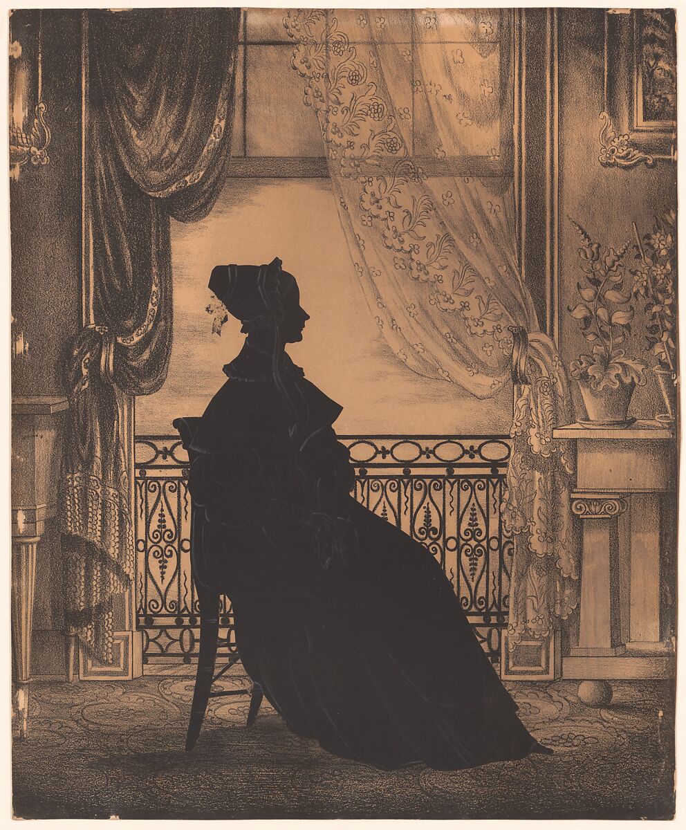 While its subject is unknown, this image has been linked to William Henry Brown, who was among the most prolific silhouette portraitists of the nineteenth century. Brown tended to affix his silhouettes to sepia-toned lithographs that mimicked the look of drawings, as is the case here. Usually made by cutting a profile portrait from black-inked paper, silhouettes were wildly popular throughout the nineteenth century. The democratic nature of the art form can be attributed to the affordability of the materials involved; as scissors, ink, and paper were relatively inexpensive, silhouettes could be commissioned for relatively small sums.