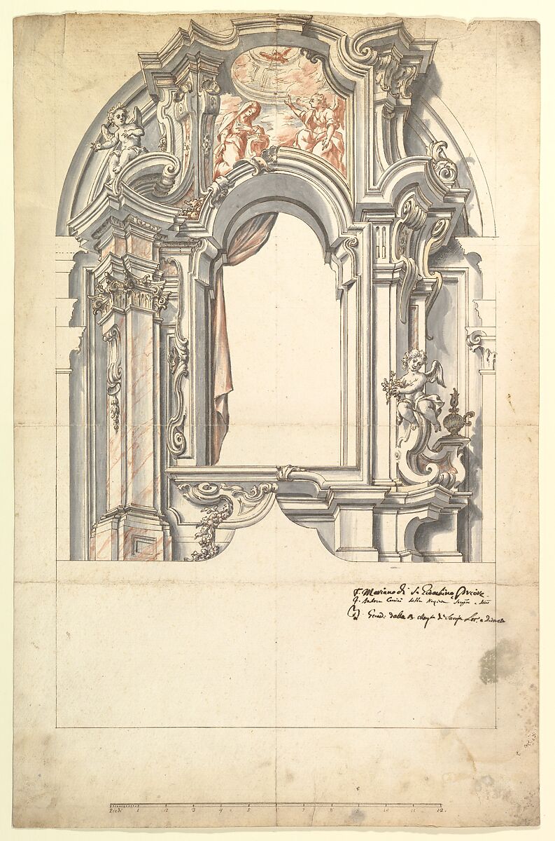 - Medium: Pen and brown ink, brush with gray and red-chalk wash, over graphite or leadpoint, with ruled and compass construction; framing outlines in pen and brown ink; scale, at bottom, in pen and brown ink