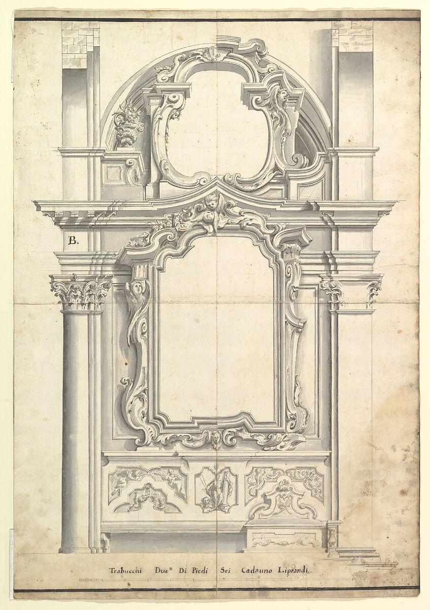 - Medium: Pen and gray ink, brush and gray wash, over graphite or leadpoint, with ruled and compass construction; framing outlines in pen and dark gray ink; scale, at bottom, in pen and gray ink