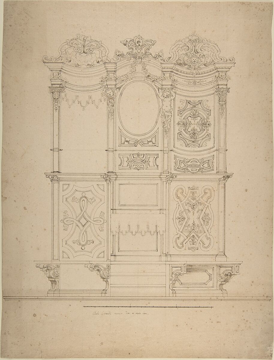 - Medium: Pen and brown ink, over leadpoint or graphite, with ruled and compass construction; measuring scale, at bottom of design, in pen and brown ink